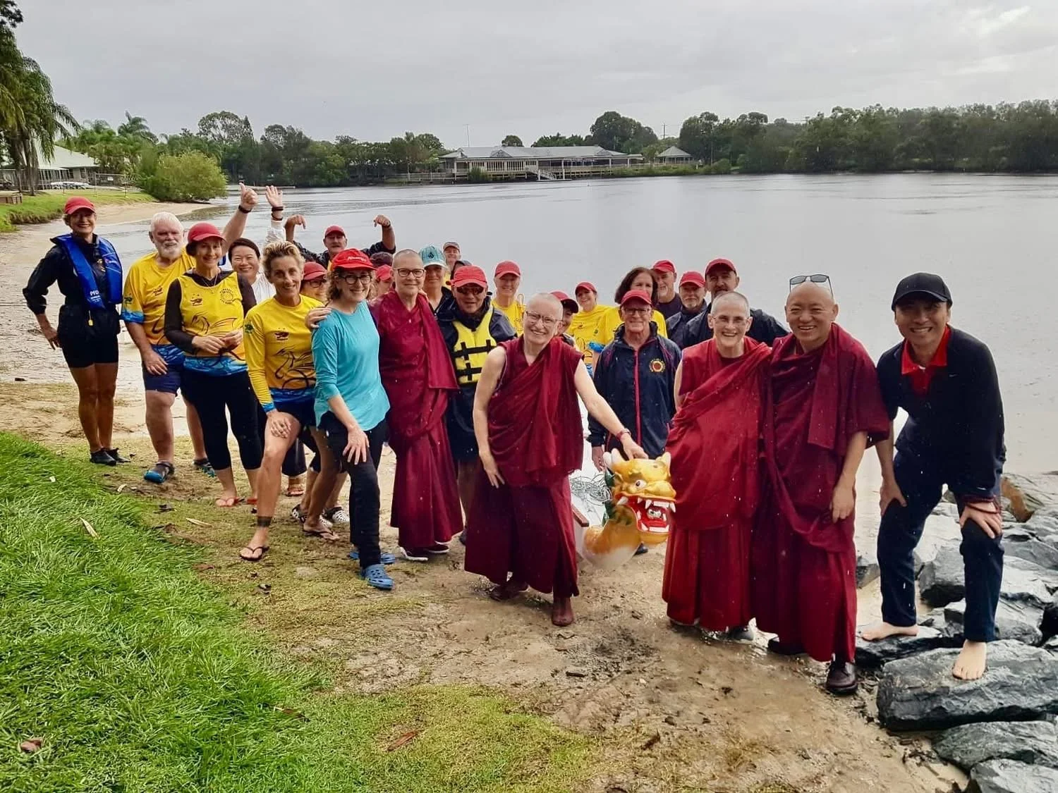 Our previous event was a deeply meaningful and joyful experience. Members of the Maroochy Sea Serpents Dragon Boat Club and Chenrezig Institute paddled together along Eudlo Creek — even a gentle morning shower couldn’t dampen the spirit of community and connection. We towed the Namgyalma Mantra boards through the water to bless and liberate all beings who come into contact with it, a practice highly recommended by Kyabje Lama Zopa Rinpoche. Geshe Tsultrim led prayers for this auspicious activity, and we extend heartfelt thanks to the Amitabha Buddhist Centre of Singapore for offering our Namgyalma Mantra Board.