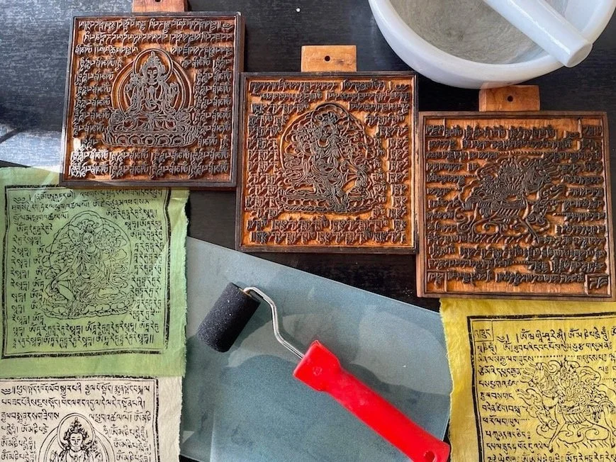 The beautiful hand carved wood blocks with the traditional designs of the Wind Horse, Green Tara, Chenrezig and more, will be printed on cloth before colouring with natural plant dyes. Indigo (Blue) Red (Madder) Yellow (Turmeric and Pomegranate) and Green (Yellow+Indigo) representing sky, air, fire, water and earth